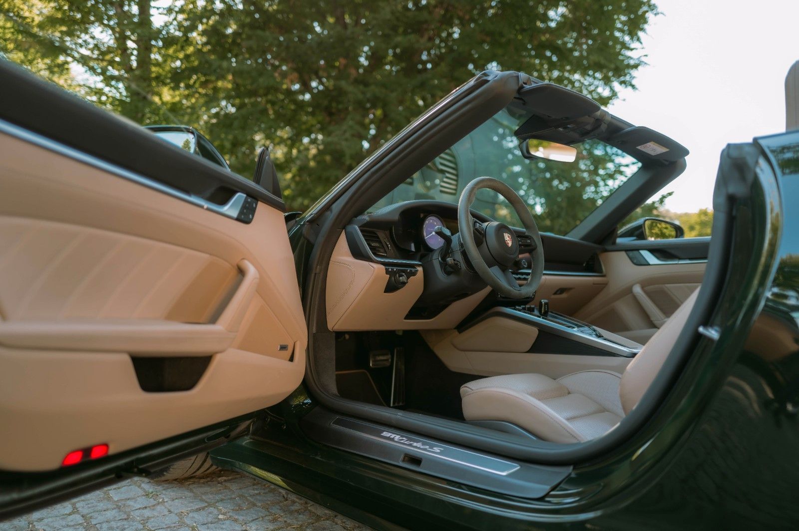 This breathtaking Porsche 911 Turbo S Cabriolet is finished in the ultra-exclusive Paint-to-Sample Brewster Green, a deep, rich tone that is rarely seen outside the most exclusive Porsche collections. Complementing the exterior is a meticulously tailored beige leather interior. Factory-optioned with an extraordinary range of bespoke features and performance enhancements, this Turbo S sets itself apart not just in appearance but in technology, comfort, and dynamic capability.